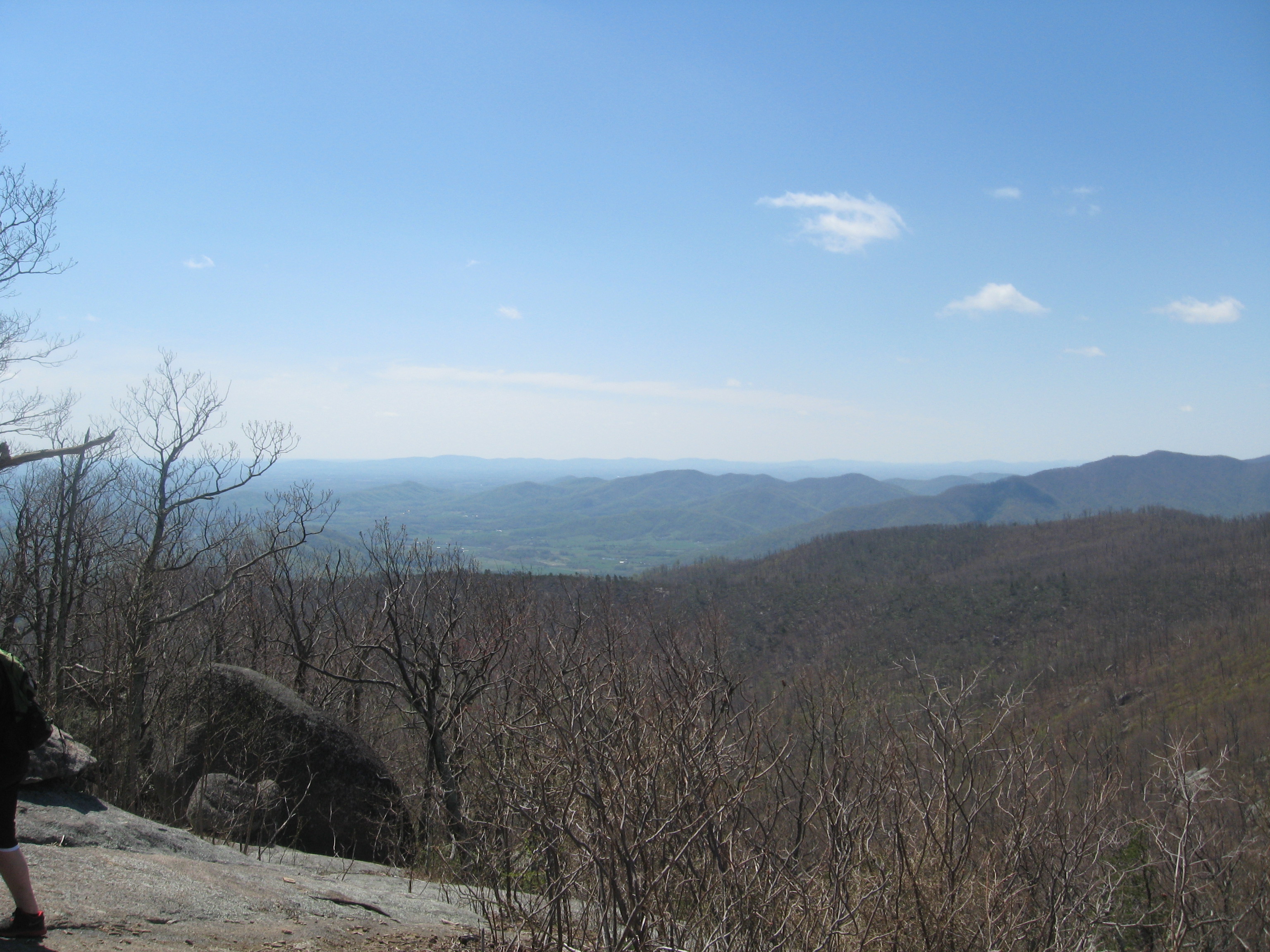 The Ridge trail head lay some distance, perhaps a mile or so, from the parking area, which at 8:30am was quickly filling with cars. The bright, late spring day, with full sun and cool temperatures, made for a perfect day to attempt a climb to the top of the Old Rag Mountain (in west-central Virginia (Madison County). We climbed out of the cars that brought us here, gathered our gear, paid our entrance fee, and began the hike to where the real hike would begin. All around us, the nascent and emergent signs of spring tantalized our senses, as did the bubbling noises of Brokenback Run, strengthened by heavy rain from a storm that had lashed the area the day before. The storm, with its high winds as well as rain, proved to be a blessing in disguise since it kept the normally busy trail from becoming a foot-sore version of I95. What was their loss, was our gain, as the trail, though a bit wet and muddy in spots, was open and the path clear to both the summit and the fire trail on the way back.