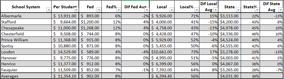 In terms of per student funding, Federal money averages eight percent in most of the localities, but accounts for twelve percent in Stafford and Chesapeake. State money accounts for thirty-seven percent on average, but rises to forty-five to forty-six percent in Stafford, Chesapeake, and Chesterfield. In terms of local funding, Stafford and Chesapeake rank last at forty-three percent (the average is fifty-five). While the percentages hint at the problem, a comparison of dollars shows the real problem – local funding in Stafford is $1,400 less per student than in Spotsylvania, Stafford’s nearest equivalent school system.