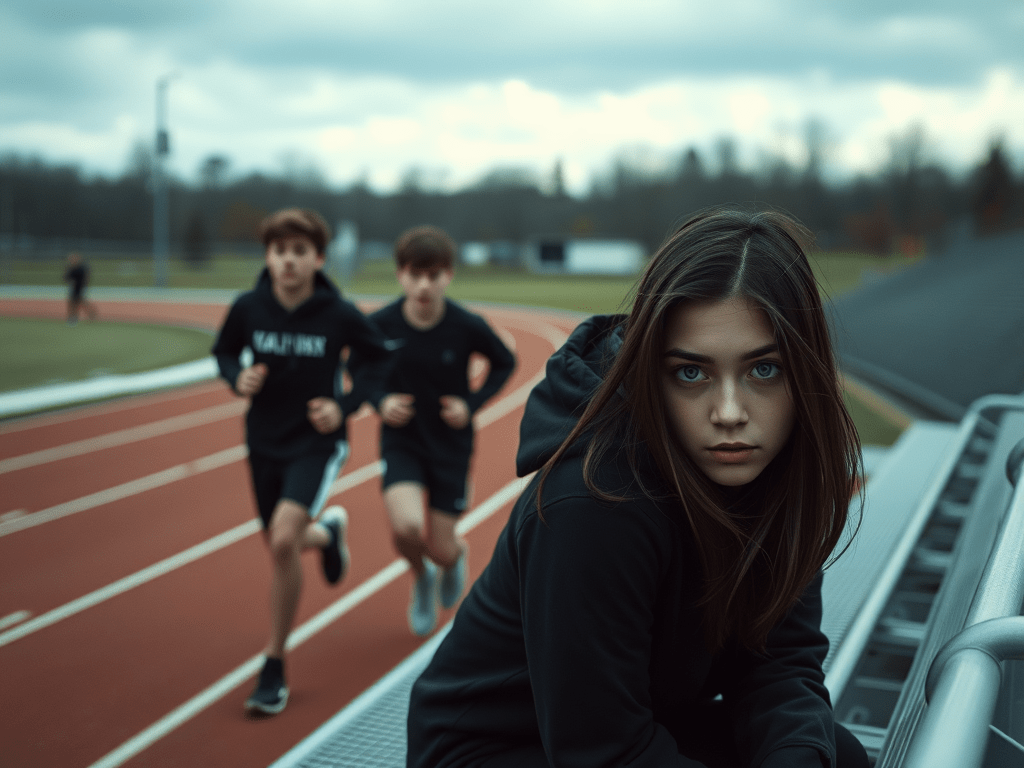 She looked away, ignoring him. He pursed his lips and looked at Jake. “C’mon, Jake. We have some more sprints to do.” Jake turned and started walking away. Kip draped the sweatshirt across Meg’s shoulders anyway. As he stepped away, she shrugged, and it fell on the bench.