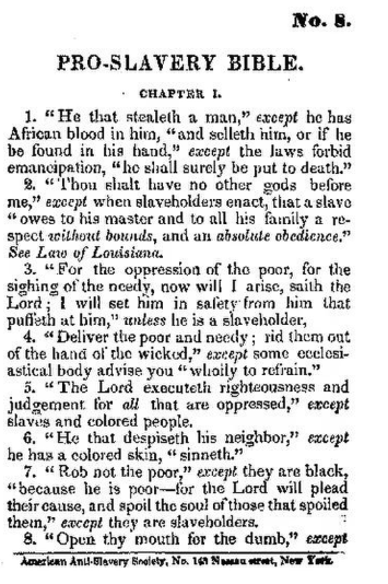 The Slave Bible was a version of the King James Bible edited specifically for enslaved people. First published in 1807 by the American Bible Society, it was the only Bible allowed to be owned by enslaved people in many states.