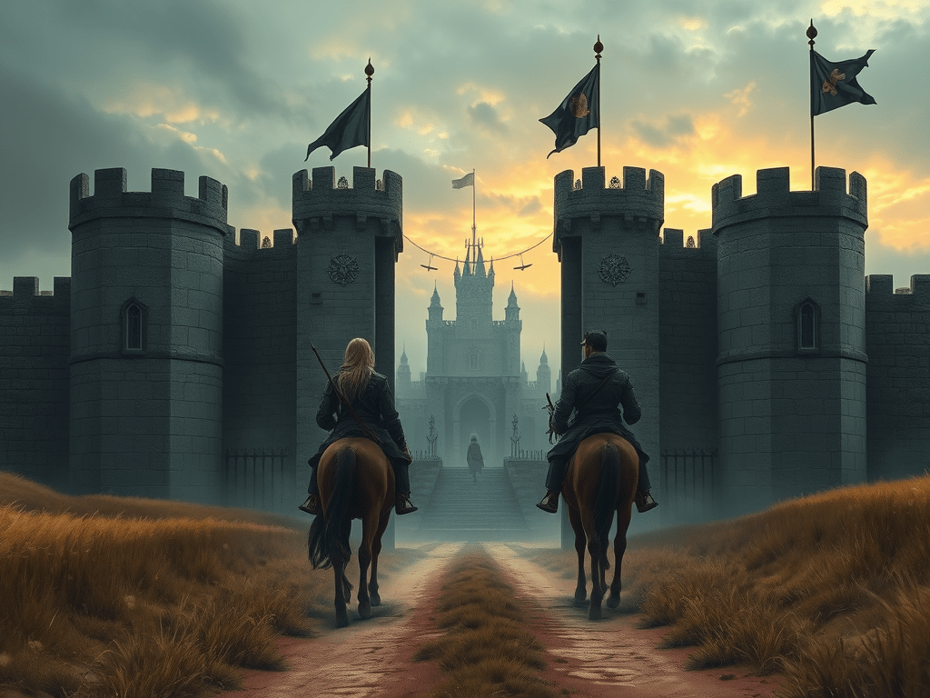 “So deep only the Creator has seen the bottom.” Gall again looked at him. “Or so the legend says.” The wind carried the faint scent of approaching rain and distant woodsmoke. “We’d better get to the gates before dark. Otherwise, we’ll have to camp outside the walls.” He spurred his mount, the horse’s hooves rhythmically drumming against the hard-packed earth. Riasean followed, the landscape around them a monotonous canvas of browns and grays, broken only by the imposing silhouette of Landros growing larger with each stride.