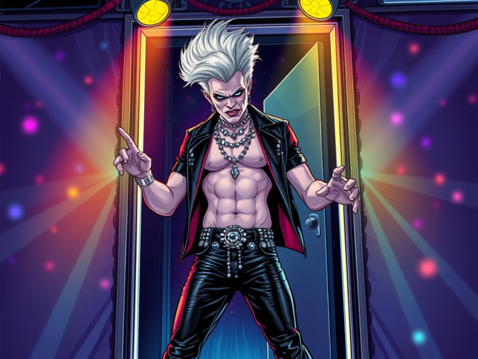 The ghost wore leather pants so tight they looked painted on, covered in rhinestones that spelled out words Ed couldn’t read in the strobing light. His shirt was open, revealing a pale, hairless chest and approximately 40 silver necklaces. His hair defied both gravity and reason—a platinum blonde pompadour that added six inches to his height. Eyeliner. Lipstick. Rings on every finger. And boots with heels that would’ve made a stripper jealous.