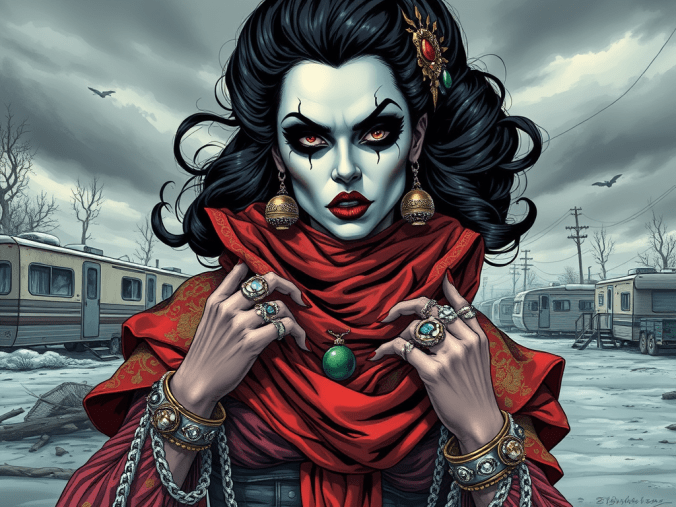 She was stunning and terrifying in equal measure. Her face was painted stark white, with dramatic black eyeliner that extended to her temples. Her lips were blood red. She wore what looked like a fortune teller’s costume amplified to theatrical extremes—scarves upon scarves, enormous rings on every finger, bangles that chimed when she moved. Her dark hair was piled high in an elaborate updo, shot through with silver.