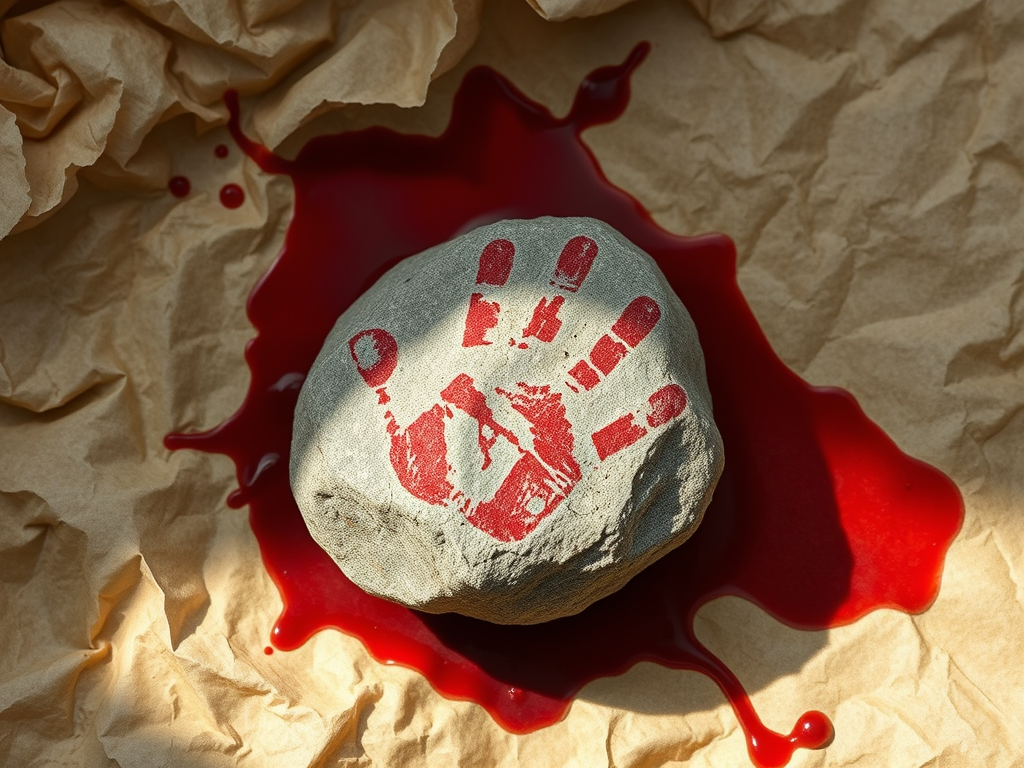 Inside was a rock, with dried blood on it, and a handprint in the shape of her hand. On the inside of the paper wrapper was written a single word: “Justice.”