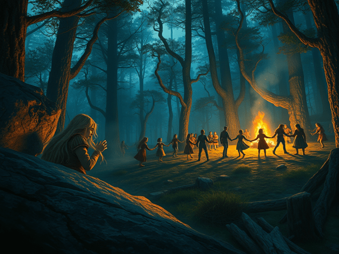 As she crept closer, she could see figures outlined by the fires, people her size moving about the boundary of the firelight, hand-in-hand, singing in high-pitched voices. Slowly, she crept from rock to rock, getting nearer the blazes. The singing had a bouncy vibrancy, ebbing and flowing with the dancers’ movements. The language, however, was foreign to her, consisting of short phrases and strange rolling sounds.